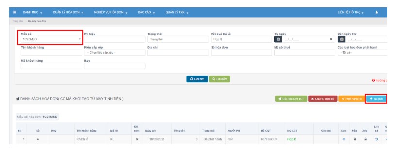 Bước 1: Từ giao diện chính, truy cập Menu ngang -> Quản lý hóa đơn -> Danh sách hóa đơn. Chọn Mẫu số hóa đơn khởi tạo từ máy tính tiền, sau đó nhấn Tạo mới để bắt đầu.