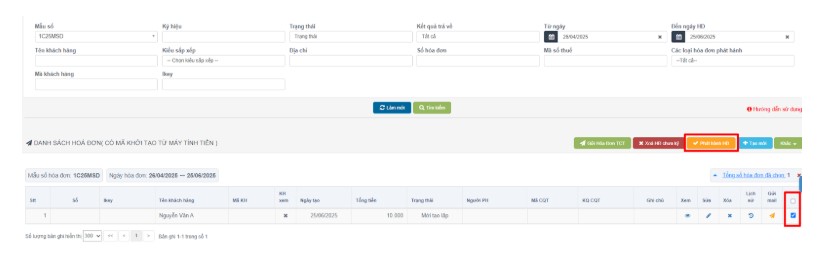 Bước 4: Tích chọn hóa đơn cần phát hành trong danh sách, sau đó nhấn Phát hành hóa đơn.