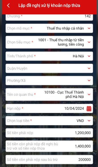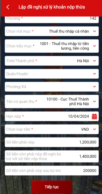 Bước 4: Điền các thông tin của người làm đơn đề nghị xử lý khoản nộp thừa -> Chọn “Tiếp tục”