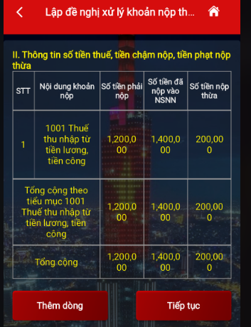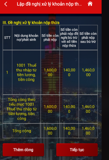 Bước 7: Xác minh lại thông tin các khoản đề nghị xử lý khoản nộp thừa -> Chọn “Tiếp tục”